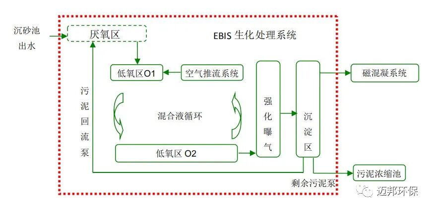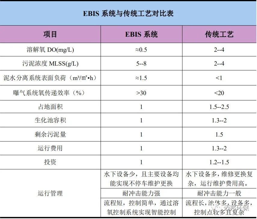 项目难点 1、本项目进水主要为市政污水(含部分工业废水),出水要求较高,设计出水COD≤30 mg/L,出水NH3-N ≤1.5mg/L。 2、本项目改造占地紧张、周期较短、施工难度较大,应用EBIS一体化系统可大大减少了新增占地,缩短土建施工及设备安装周期,最大程度上保证工程进度。 附:EBIS工艺优势 EBIS工艺结合了多项专利技术的同时,使其出水稳定可靠,相比其它传统工艺具有以下优势: 1、节能 低氧运行参数及高效的曝气系统将充氧效率大大提高,使鼓风机的能耗降低50%以上;同时,由于是一体式结构,中间节省了传统工艺的机泵设备,也为运行节省了能耗,基于实际项目的耗电量统计,EBIS系统设计的污水厂总耗电量要比传统工艺节省30%以上。 2、节省投资和占地 由于EBIS系统污泥浓度高,系统容积负荷较传统工艺高,使系统总池容小于传统工艺的生化池池容,同时一体式结构省略了二沉池,节省了占地面积和土建投资。 EBIS系统一体化池形结构和以空气推流系统实现的大循环特点,使生化池节省了推流搅拌器、污泥回流泵等设备,使池内设备减少,降低了设备投资。 3、剩余污泥量低 低溶氧、低污泥负荷的工艺控制条件下,使得EBIS系统的污泥龄延长,同时减低了剩余污泥量。甚至某些对总磷没有出水要求的工业项目,实现剩余污泥零排放,系统自身达到较好的平衡。 4、耐冲击能力强 由于智能溶氧控制系统(DOCS)是为EBIS系统量身定做,该控制系统可以根据水质水量的变化以及同步脱氮过程中溶氧、氨氮、硝氮以及总氮之间的关系,综合判断系统的实际需氧量,智能调节需氧和供氧的关系,同时由于系统本身有大循环稀释系统及高污泥浓度,可有效降低由于来水水质变化造成的系统冲击,保证出水稳定。